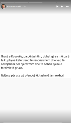 “Për miqtë gazetarë, që po kërkojnë prononcim për veshjen time në Kuvend! Sinqerisht, më me dëshirë kisha marrë pyetje për sukseset e kësaj qeverie, për rikthimin e shkëlqimit të skenës kulturore, etj. Por unë nuk kam as mundësi që të zgjedh pyetjet, njëjtë siç askush nuk ka mundësi të vendosë qysh unë vishem ne Kuvend. Veshjet e mia gjithmonë janë artistike, pasi unë, mbi të gjitha, jam artiste dhe ashtu do të mbetet përjetësisht! Shijet janë relative, por edhe individuale. Veshja nuk më bën as deputete të keqe, as të mirë. Unë po e luaj rolin tim si deputete, për çfarë jam votuar. Kjo ka rëndësi! Por edhe një gjë e kam pritur: më shumë mbështetje nga gazetarët. Jam shumë e lumtur që jetoj në një kohë kur gratë në të gjithë botën e mbështesin fuqishëm njëra-tjetrën, në çdo rrethanë, në çdo situatë. Gratë e Kosovës, pa përjashtim, duhet që sa më parë të kuptojnë këtë trend të rëndësishëm dhe kaq të nevojshëm për njerëzimin dhe të bëhen pjesë e forcimit të gruas. Ndërsa për ata që ofendojnë, tashmë jam rexhur”,- u shpreh Adriana duke nënkuptuar se është mësuar me vrerin online.