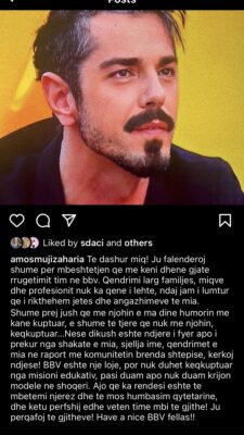 “Shumë prej jush që më njohin e ma dinë humorin më kanë kuptuar, të tjerë që nuk më njohin, e kanë keqkuptuar. Nëse dikush është ndjerë i fyer apo i prekur nga shakatë e mija, sjellja ime, qëndrimet e mija në raport me komunitetin brenda shtëpisë, kërkoj ndjesë! Ajo që ka rëndësi është të mbetemi njerëz dhe të mos humbasim qytetarinë dhe këtu perfshij edhe veten time mbi të gjithë”-shkruan mes të tjerash Amosi.