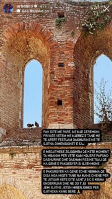 “Pak ditë më parë, në një ceremony private vetëm me njerëzit tanë më të afërt festuam dashurinë në të gjitha dimensionet e saj. E megjithëse zgjodhëm që këtë moment ta mbanim për vete kam ndjerë pafund dashurinë dhe dashamirësinë tuaj që ka qenë e pakursyer si gjithmonë. E pakursyer ka qenë edhe ndihma që disa nga miqtë tanë na kanë dhënë për të jetuar këtë ditë ashtu siç e kisha ëndërruar dhe në do t’ju jemi gjithë jetën mirënjohës për gjithçka kanë bërë”.
