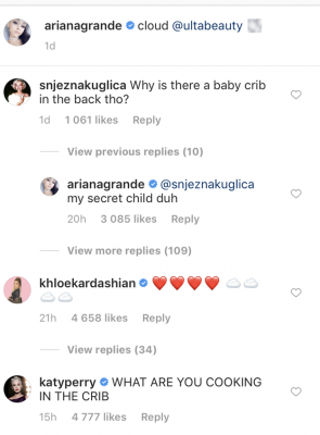 Ariana Grande, kohë më parë u largua nga vëmendja mediatike për shumë muaj dhe u përfol se mund të ishte shtatzënë. Asnjëherë nuk pati një shpjegim për këtë çështje, por me anë të një postimi të bërë një ditë më parë, vëmendja është rikthyer sërish tek këngëtarja. Në foton ku promovon albumin e fundit bie në sy një krevat fëmijësh.