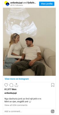 Në postimin që shoqëron momentin e veçantë, Bujupi shkroi: “Nga dashuria jonë po lind një jetë e re. Mirë se vjen, engjëlli ynë”. Një deklaratë që u prit me entuziazëm të madh nga fansat dhe miqtë e çiftit, të cilët mbushën menjëherë komentet me urime dhe mesazhe të ngrohta për prindërit e ardhshëm. Fotografia intime e çiftit, ku këngëtari vendos dorën mbi barkun e bashkëshortes, u shpërnda me shpejtësi në rrjet dhe u kthye në një nga momentet më të komentuar të ditës në showbizin shqiptar.