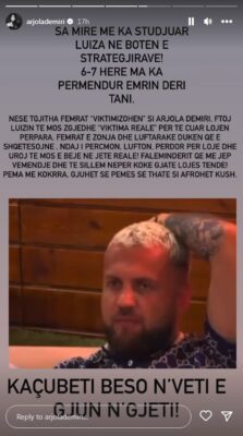 “Sa mirë më ka studiuar Luiza në botën e strategjive. 6-7 herë më ka përmendur emrin deri tani. Nëse të gjitha femrat viktimizohen si Arjola Demiri. Ftoj Luizin të mos zgjedhë viktima reale për të çuar lojën përpara. Femrat e zonja dhe luftarake duket që e shqetësojnë, ndaj i përçmon, lufton, përdor për lojë dhe uroj të mos e bëjë në jetë reale. Faleminderit që më jep vëmendje dhe të sillem nëpër kokë gjatë lojës tënde. Pema me kokrra, gjuhet se pemës së thatë si afrohet kush. Kaçubeti beso n’veti e gjun n’gjeti”, shkruan Arjola.