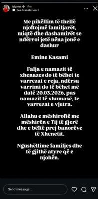 “Falja e namazit të xhenazes do të bëhet te varrezat e reja, ndërsa varrimi do të bëhet më datë 20.03.2026, pas namazit të xhumasë, te varrezat e vjetra”. Mesazhi mbyllet me lutjen: