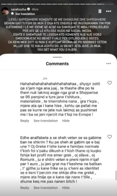 Një ndjekëse e ka akuzuar hapur Sarën, duke vënë në dyshim jo vetëm veprimet e saj, por edhe mënyrën se si ajo ushtron rolin e nënës. Reagimi nuk vonoi. Blogerja zgjodhi të mos heshtë dhe përmes një InstaStory ndau publikisht komentin, duke sqaruar pse nuk i fshin këto mesazhe, edhe pse e pranon se shpesh e tundon ta bëjë për të ruajtur qetësinë e saj.
