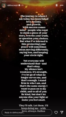 Heshtja ime nuk është dobësi. Është forcë. Kam lënë pas gjithçka që nuk më shërben më, dhe kjo mjafton. Qëndroj e palëkundur në atë që jam, dhe këtë energji dua t’ia përcjell fëmijës tim dhe të gjithëve ju: Jini të mirë, por mos lejoni askënd t’jua zbehë dritën apo t’ju bëjë të ndiheni të vegjël. Do të flasin. Le të flasin. Unë do të vazhdoj të jem vetja – me dashuri, gjithmonë, Dafina.”