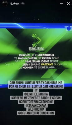 Pas surprizës së marrë nga “Top Channel”, i cili i dha mundësinë Einxhel të ketë një emision i cili do t’i vijë në ndihmë të gjitha vajzave që duan të shkollohen, Dj Dagz ka shprehur emocionet e tij.