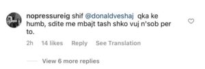 “Ndryshe nuk do t’i ecte kënga vetëm duke bërë dedikime për Donaldin”; “Shiko @donaldveshaj çfarë ke humbur, s’dite me e mbajt, tani shkoj vuaj për të”,- janë disa prej komenteve që shfaqen poshtë videos së Beatrix.