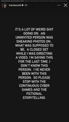 Travis Scott është kthyer në qendër të vëmendjes dhe shkak është bërë një modele Instagrami. Dy vite më parë ajo bëri bujë pasi u përfol si arsyeja e ndarjes së Kylie Jenner me Travis Scott. Modelja Yung Sweet Ro është rikthyer duke publikuar së fundmi një video nga prapaskenat e xhirimeve të Scott për një projekt. Menjëherë rrjeti ka shpërthyer në akuza se reperi e ka tradhtuar Kylien, me të cilën ka tashmë dy fëmijë. Mirëpo Scott duket se nuk fal kur vjen puna tek trillimet. Reperi ka bërë një reagim sqarues në Instastory, duke i hedhur poshtë akuzat. “Gjëra të çuditshme po ndodhin. Një person i paftuar ka shkrepur foto tinëz kur po xhiroja një video. Po e them për herë të fundit. Nuk e njoh këtë person. Nuk kam qenë kurrë me këtë person. Prandaj, mjaft me këto lojëra dhe trillime”, ka shkruar ai.
