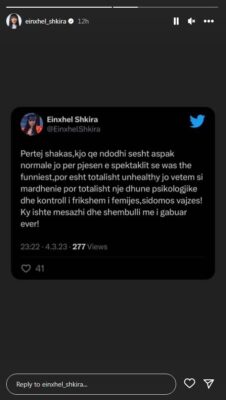 “Përtej shakas, kjo që ndodhi s’është aspak normale jo për pjesën e spektaklit se ëas the funniest, por është totalisht unhealthy jo vetëm si marrëdhënie por totalisht një dhunë psikologike dhe kontroll i frikshëm i fëmijës, sidomos vajzës! Ky ishte mesazhi dhe shembulli më i gabuar ever”, ka shkruar Einxhel.