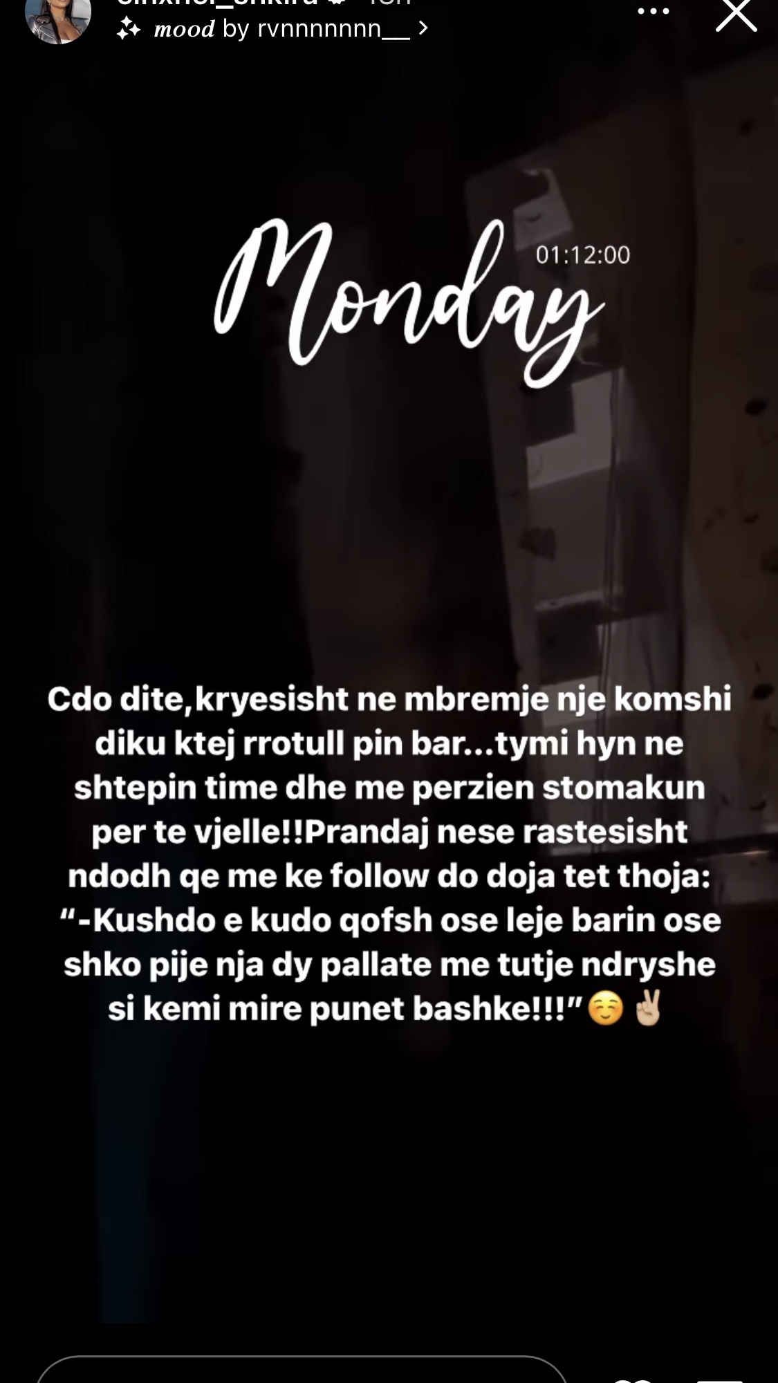Prandaj, nëse rastësisht ndodh që më ke follow do doja të të thoja: “kushdo e kudo qofsh ose leje barin ose shko pije nja dy pallate më tutje ndryshe si kemi mirë punët bashkë!”, është shprehur Einxhel në postim.