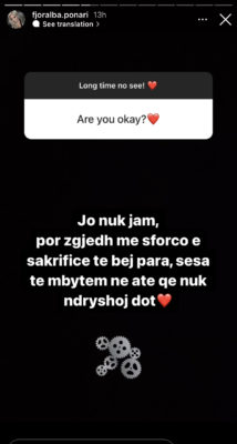 Me anë të pyetësori në Instagram, Fjoralba Ponari ka treguar pak më shumë për gjendjen e saj pas humbjes së nënës. E pyetur nga një ndjekës a është mire, ajo është përgjigjur: “Jo nuk jam, por zgjedh me sforco e sakrificë të bëj para, sesa të mbytem në atë që nuk ndryshoj dot”.