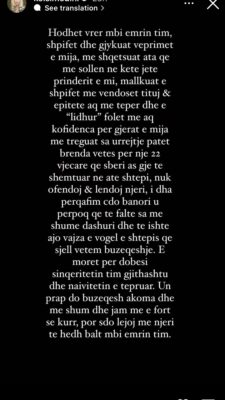 “Hodhët vrer mbi emrin tim, shpifët dhe gjykuat veprimet e mia, më shqetësuat ata që më sollën në këtë jetë, prindërit e mi, mallkuat e shpifët, më vendosët tituj dhe epitete, aq më tepër edhe “e lidhur”. Folët me aq kofidenca për gjërat e mia. Treguat gjithë urrejtjen që patët brenda vetes për një 22-vjeçare që s’bëri asgjë të shëmtuar në atë shtëpi, nuk ofendoi e lëndoi njeri. I dha përqafim çdo banori, u përpoq të falte sa më shumë dashuri dhe të ishte ajo vajza e vogël e shtëpisë, që sjell vetëm buzëqeshje. E morët për dobësi sinqeritetin tim, gjithashtu edhe naivitetin e tepruar. Unë prapë do të buzëqesh akoma më shumë dhe jam më e fortë se kurrë, por s’do të lejoj më njeri të hedhë baltë mbi emrin tim”, ka shkruar ajo në “Instastory”.