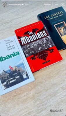 Në “Instastory”-n e saj, Ivanka ka ndarë një foto me tre libra, që duket se i ka zgjedhur posaçërisht për të kuptuar më shumë rreth historisë dhe kulturës sonë. Midis tyre janë “Albania: From Anarchy to Balkan Identity” nga Miranda Vickers dhe James Pettifer, “The Albanians: A modern history” po nga Miranda Vickers, si edhe një klasik shqiptar që nuk mund të mungonte: “Gjenerali i ushtrisë së vdekur” i Ismail Kadare.