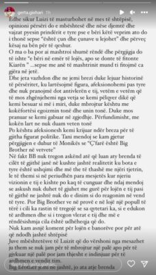 “Edhe sikur Luizi të masturbohet në mes të shtëpisë, opinioni përsëri do e mbështesë dhe nëse djemtë dhe vajzat pyesin prindërit e tyre pse e bëri këtë veprim ato do i thonë sepse “është çun dhe çunave u lejohet” dhe përveç kësaj na bën për të qeshur. O ma o ba por ai mashtroi shumë rëndë dhe përgjigja do të ishte “e bëri në emër të lojës, apo se donte të fitonte Kiarën”…sepse me anë të mashtrimit mund t’i fitojmë ca gjëra në jetë. Dhe jeta vazhdon dhe ne jemi brezi duke lejuar historinë të përsëritet, ku lartësojmë figura, afeksionohemi pas tyre dhe nuk pranojmë dot antivlerën e tij, vetëm e vetëm që të mos zhgënjehemi nga vetja se kemi pëlqyer dikë që kemi besuar si më i miri, duke mbrojtur kështu me kokëfortësi egoizmin tonë dhe unin tonë. Duke mos pranuar se kemi gabuar në zgjedhje. Përfundimisht, me kokën lart ne nuk duam veten tonë. Po kështu afeksionesh kemi krijuar ndër breza për të gjitha figurat politike. Mendoj se kam gjetur përgjigjen e duhur të Monikës se “Çfarë është Big Brother në vetvete” Në fakt BB nuk tregon askënd atë që luan aty brenda të cilët të gjithë janë në kushte jashtë realitetit ku bota e tyre është ushqimi dhe më the të thashë me njëri-tjetrin, le të themi si në përiudhën e mesjetës kur njeriu vizionin e tij e kishte po kaq të cunguar dhe ndaj mendoj se askush nuk duhet të gjuhet me gurë për lojën e tij pasi të gjithë ne jashtë nuk do e dinim si do reagonim në vend të tyre. Por Big Brother vë në provë e në lojë një popull të tërë i cili ka rastin të tregojë se sa qytetari ka, si e edukon të ardhmen dhe si i tregon vlerat e tij dhe më e rëndësishmja cila është udhëheqja që do. Nuk kam asnjë koment për lojën e banorëve por për atë që ndodh jashtë shtëpisë. Juve mbështetësve të Luizit që do vërshoni nga mesazhet ju them se nuk jam për të mbrojtur një palë apo për të gjykuar një palë, por jam thjesht e indinjuar për të ardhmen e vendit tim. Big Brother jemi ne jashtë, jo ata atje brenda.”