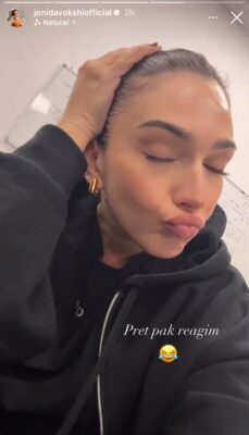 Pas disa ditësh qetësi, moderatorja u rikthye me një Instastory ku duket e relaksuar dhe me buzëqeshjen e saj karakteristike. Videoja shoqërohej pikërisht me frazën që e futi në qendër të vëmendjes: “Pret pak reagim”, me një emoji duke qeshur me lot, një kundërpërgjigje plot ironi për gjithë zhurmën online.