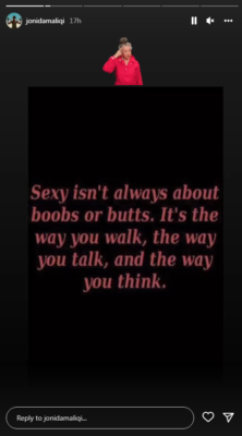“Të jesh seksi nuk ka të bëjë gjithmonë me gjoksin dhe të pasmet. Ka të bëjë me mënyrën si ecni, si flisni dhe si mendoni”, shkruhet në postimin e publikuar nga Jonida.