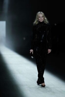 “Supermodelja britanike, 52 vjeç, mbylli sfilatën e parë të Demnës për Gucci në Milano, duke ecur në pasarelë me një fustan të zi me jakë të lartë të prerë thellë në anë që zbulonte një tanga të dukshme.” Një imazh që, në mënyrë të vetëdijshme, rikthen debatet e dikurshme mbi sensualitetin dhe fuqinë vizuale të modës.