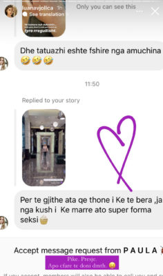 Pas këtij postimi, moderatorja ka publikuar mesazhin e një prej ndjekësve, që i ka shkruar: “Për të gjithë ata që thonë i ke të bëra, ja nga kush i ke marrë ato super forma seksi”.