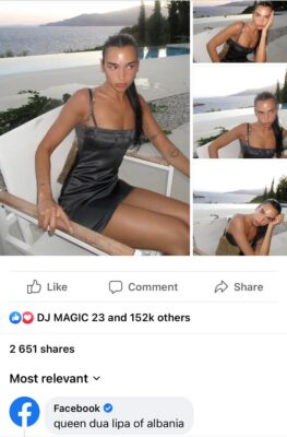 Fotot e fundit të Dua Lipës kanë tërhequr sërish vëmendjen e Mark Zuckerberg. Së fundmi, këngëtarja po shijon disa ditë pushime në bregdetin shqiptar para festivalit “Sunny Hill” dhe ndau disa foto ku dukej elegante me një fustan e flokët e lagur. “Vajzë shqiptare në Shqipëri”, shkruan Dua krah fotove dhe ky postim nuk ka kaluar pa u vënë re nga “Facebook”, ku në hapësirën e komenteve ka lënë një kompliment. “Dua Lipa Mbretëresha e Shqipërisë”, shkruan gjigandi i rrjeteve sociale.