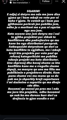 “Ky sezon jam detyruar të ndal të gjitha projektet për shkak të konflikteve dhe padrejtësive që më janë bërë nga distributori paraprak. Deri sa këto konflikte të zgjidhen, do t’i mbaj projektet për vete dhe refuzoj kategorikisht t’i publikoj me këtë distributor,” shkroi ai.