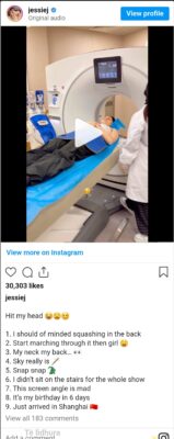 Pavarësisht situatës, Jessie J zgjodhi transparencën me publikun, duke ndarë momentet e saj më të brishta në rrjetet sociale. Me një përzierje humori dhe sinqeriteti, ajo shkruan: “Hit my head 😂😩🥴”, ndërsa rendit me ironi detaje nga momenti, një mënyrë për të lehtësuar tensionin dhe për të mbajtur lidhjen me fansat e saj.