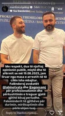 “Jam i liruar nga masa e arrestit. Falënderoj avokatët e mi për profesionalizmin,” shkroi Mjekiqi, duke lënë të kuptohet se pas gjithë situatës së tensionuar, ai ndihet i lehtësuar dhe mirënjohës.