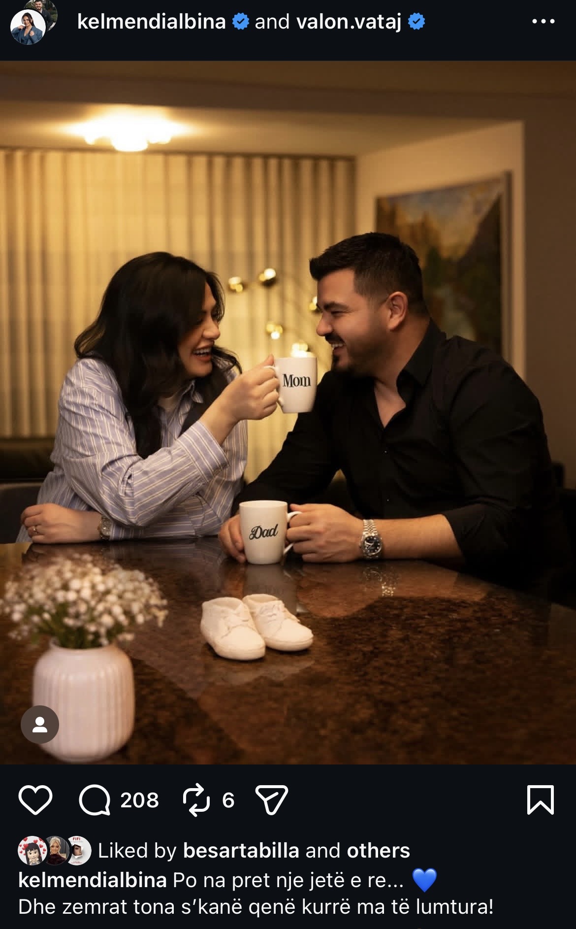 Në postimin e publikuar, çifti ka shprehur emocionet dhe gëzimin për këtë etapë të re në jetën e tyre. “Po na pret një jetë e re… Dhe zemrat tona s’kanë qenë kurrë më të lumtura!”, ka shkruar Albina krahas fotos. Një detaj që ka tërhequr vëmendjen e ndjekësve është zemra blu e përdorur në fund të përshkrimit, duke nxitur spekulime se ata mund të presin një djalë.