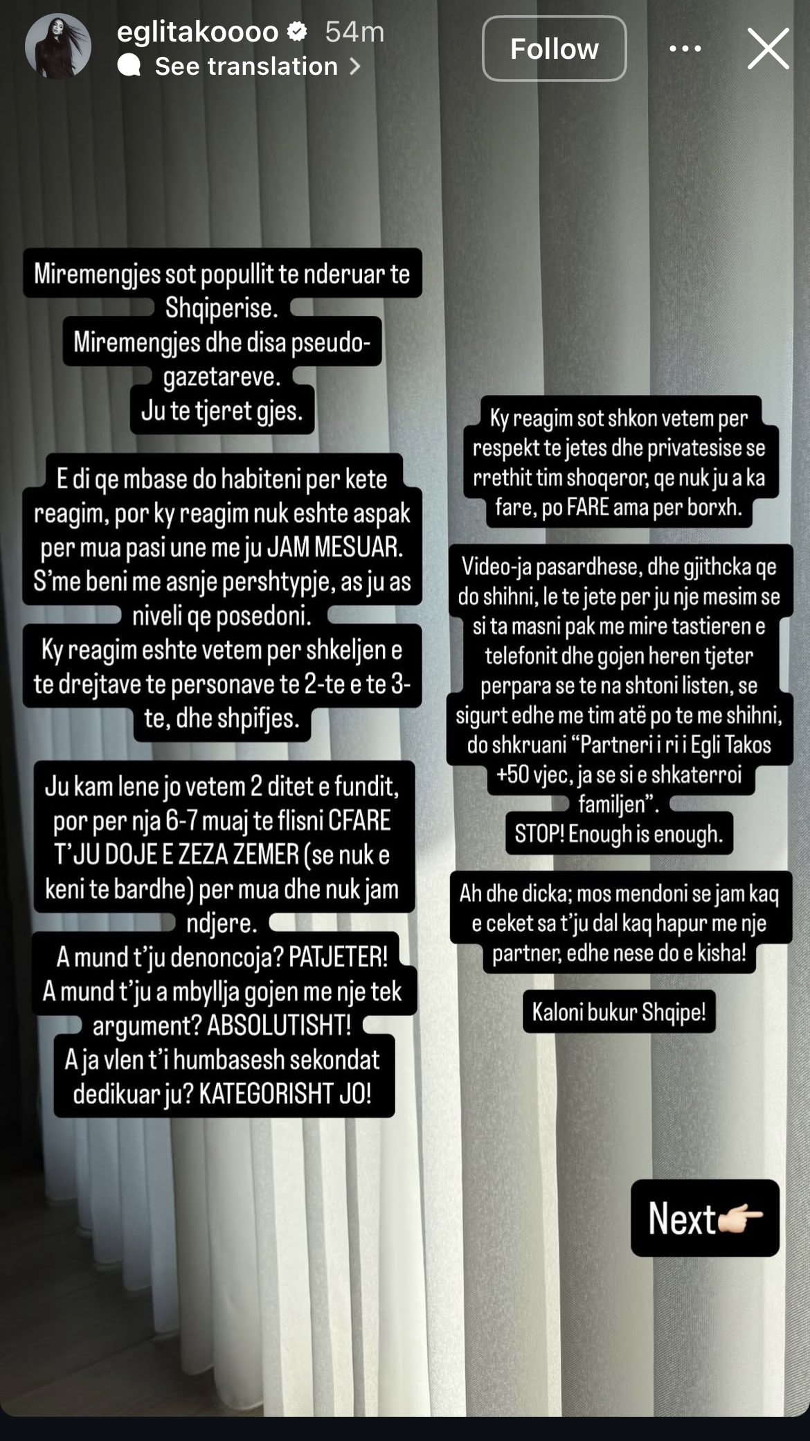 “Mos mendoni se jam kaq e cekët sa të dal kaq hapur me një partner, edhe nëse do e kisha! STOP! Enough is enough,” – përfundoi Tako.