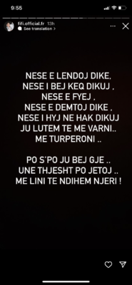 “Adisi është babë dhe e ka një fëmijë? Po dhe do t’ja respektoj fëmijën si me qenë i imi përndryshe do të thotë që se dha njeriun që kam në krah. Adisi ka qenë i martuar? Po ka qenë po si kam nda unë dhe shyqyr se e di shumë ça do ndodhte. Aman merruni me jetën tuaj. Më lini të jetoj aman. Përtej këngës, përtej muzikës, kam dhe unë një jetë. Dikush zgjedh ta bëj publike dikush jo. Unë kam treguar çdo gjë timen. E bëra. E ndava me ju. E hëngra. Bëra gabim? Trashanik! Por e bëra, nëse s’ju pëlqen më bëj bllok, por më lini të jetoj. Nëse e lëndoj dikë, nëse i bëj keq dikujt, nëse e fyej, nëse e dëmtoj dikë, nëse i hyj në hak dikujt ju lutem të më varni. Më turpëroni. Po s’po ju bëj gjë. Unë thjesht po jetoj. Më lini të ndihem njeri! Adrola? Yll padiskutim. Dhe po, absolutisht një prej femrave më të bukura që sytë e mi kanë parë. Do e respektoj çdo ditë jo vetëm si nënën e fëmijës së njeriut që po jetoj me të, por si grua, si vajzë, si punëtore, si shembullin më të mirë të një femre që punon dhe rrit krijesën më të shtrenjtë në botë. Të më shani? Ta shani? Bllok do keni. Shnet!”, shkruan Fifi.