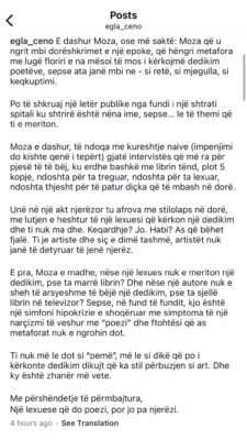 Deklarata e prerë e Mimozës, “Nuk i dhuroj njeriu libra”, u komentua gjerësisht, veçanërisht pas reagimit të menjëhershëm të Egla Cenos. Aktorja zgjodhi t’i përgjigjej me një letër të hapur në rrjetet sociale, ku e akuzoi Ahmetin për “qëndrim përbuzës dhe narçizëm të tejskajshëm”.