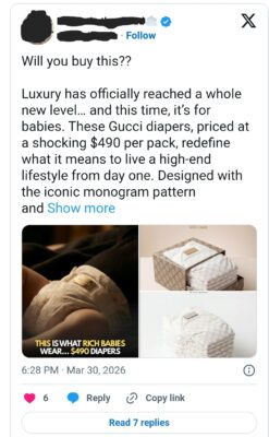 Një imazh i vetëm mjaftoi për të ndezur një debat global. Pelena për foshnja me logon ikonike të Gucci, të raportuara me një çmim marramendës prej 490 dollarësh për paketë. Fotot u përhapën me shpejtësi në rrjete sociale, duke ngritur një pyetje që preku nervin e kohës: deri ku mund të shkojë moda luksoze? Reagimet nuk vonuan, me përdorues që shkruanin: “Luksi ka arritur zyrtarisht një nivel krejt të ri… dhe këtë herë, është për foshnjat”, ndërsa të tjerë shtonin me skepticizëm: “A ndihmon në rritje? Apo pse duhet të jetë kaq i shtrenjtë?.. Ndoshta është menduar për elitën, në fund të fundit”.