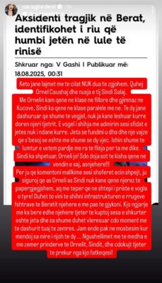 Dhimbja ka prekur thellë ish-banoren e Big Brother VIP Albania, Sara Gjordeni, e cila ka reaguar publikisht pas aksidentit tragjik në Berat ku humbi jetën shoku i saj i ngushtë i fëmijërisë, Orneli.