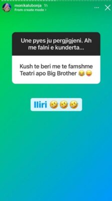 Sherret mes Monika Lubonjës dhe Ilir Shaqirit ishin padyshim ndër më të komentuarat në “BBVIP” e duket se gjakrat nuk janë ftohur edhe pas mbarimit të spektaklit. Sot Monika ka realizuar një bisedë virtuale me ndjekësit e saj, ku nuk kanë munguar pyetjet në lidhje me Ilirin dhe Monika nuk ka ngurruar t’ju përgjigjet duke ironizuar situatën. Një ndjekës e ka pyetur aktoren se kush mendon se e ka bërë të famshme dhe me ironi ajo është përgjigjur: “Iliri”, me disa emoji duke qeshur. Nëse mendon ta rikthejë ndonjëherë miqësinë e saj me Ilirin, ish-banorja u përgjigj: “Si rikthehet diçka që nuk ka ekzistuar ndonjëherë!” Ndërkohë Iliri është kundërpërgjigjur me një foto në Instastory krah së cilës shkruan: “I qan shpirti kësaj bananes për pak pleh Iliri”, duke treguar qartë që i referohet Monikës pasi aktorja gjatë BBV tregoi se i pëlqen shumë bananet. Por nuk ka munguar as përgjigja e aktores, e cila ka postuar një foto ku tregon kuptimin e fjalës pleh dhe krah saj një figurë bananesh ku shkruhet “Faleminderit shumë”.