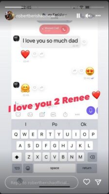 Nora dhe Roberti nuk na i kanë kursyer pozat e ëmbla me Renee-n që kur ajo ishte bebe dhe sot e kësaj dite vazhdojnë të mos e kenë fare problem këtë pjesë. Renee është rritur para syve tanë dhe tani ajo po i dërgon edhe mesazhe të bukura Robertit. Një prej tyre këngëtari ka vendosur ta ndajë me ne duke e postuar në Instastory. “Të dua shumë babi”, i shkruan Renee në anglisht të atit ndërsa Roberti ka vendosur t’ja shprehë dashurinë publikisht. “Edhe unë të dua Renee”, shkruan ai. Roberti nuk ngurron shpeshherë edhe të postojë foto me vajzën, ashtu si edhe Nora. Pavarësisht ndarjes, ish-çifti ka treguar se ruajnë një marrëdhënie të mirë që Renee mos ta ndjejë aspak mungesën e njërit prind apo tjetrit.