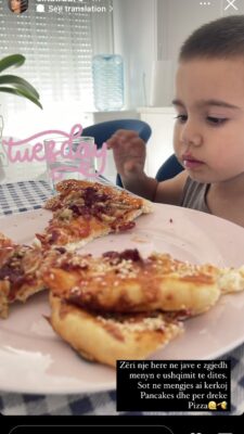 “Zëri një herë në javë e zgjedh menunë e ushqimit të ditës. Sot në mëngjes ai kërkoj Pancakes dhe për drekë pizza”, shkruan moderatorja krahas fotos së Zërit.