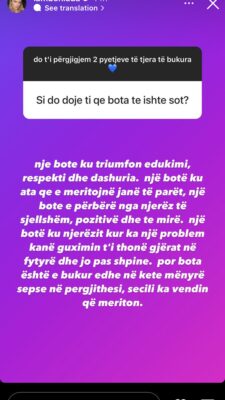 “Në botë ku triumfon edukimi, respekti dhe dashuria. Një botë ku ata që e meritojnë janë të parët, një botë e përbërë nga njerëz të sjellshëm, pozitivë dhe të mirë. Një botë ku njerëzit kur ka një problem kanë guximin t’i thonë gjërat në fytyrë dhe jo pas shpine. Por bota është e bukur edhe në këtë mënyrë sepse në përgjithësi, secili ka vendin që meriton”, ka thënë ajo.