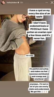 Bashkëshortja e Justin Bieber postoi një foto në “Instagram” ku tregonte barkun duke shkruar se nuk është në pritje të një foshnjeje. “Kam një kist në vezore me madhësinë e një molle. Nuk vuaj nga endometrioza ose PCOS (sindroma policistike e vezores), por më është shfaqur disa herë kisti i vezores dhe nuk është e mirë”.