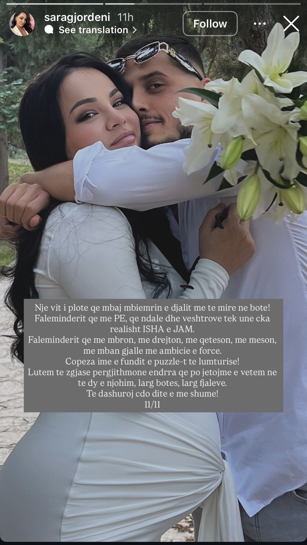 “Një vit i plotë që mbaj mbiemrin e djalit më të mirë në botë! Faleminderit që je me mua, që ndalesh dhe shikon tek unë atë që realisht ISHA dhe JAM. Faleminderit që më mbron, më drejton, më gëzon, më mëson, më mban gjallë me ambicie e forcë. Copëza ime e fundit e puzzle-t të lumturisë! Lutem të zgjasë përgjithmonë ëndrra që po jetojmë, vetëm ne të dy, larg botës, larg fjalëve. Të dua çdo ditë e më shumë! 11/11”, ka shkruar Sara.