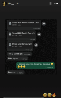 Këtë e ka zbuluar vetë Kejsi, e cila ka surprizuar ndjekësit duke shpërndarë një bisedë private me ish-partnerin e saj. Në “WhatsApp”, Stresi i ka dërguar tre demo të reja dhe i ka treguar se muzika e re mban gjurmën e saj.