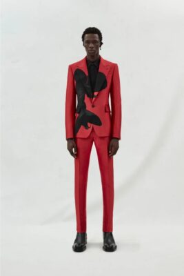 Motivi i orkides së stampuar në versionin e Ledionit dhe i qendisur në variante të tjera të koleksionit krijon kontrast të fortë mes delikatesës dhe strukturës. E kuqja mbi të zezë nuk është vetëm estetikë, është tension vizual. Një lule që duket e brishtë, por që në këtë prerje bëhet simbol force. Nuk është rastësi që kjo xhaketë, e prezantuar fillimisht në Javën e Modës në New York, vijon të duket aktuale edhe në 2026.