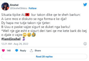 “Situata tipike shqiptare kur takon dikë që të sheh barkun. Lëre mos e diskuto se nga forma e ke djalë. Dy hapa më tutje takon një tjetër. Uuuu e paske vajzë sigurt se duket nga barku. Mirë, një gjë është e sigurt deri tani që me këtë barkë do bëj o djalë o vajzë”, ka shkruar Einxheli në “Twitter”. Një komentues i ka kërkuar që të thotë se i ka binjakë vajzë dhe djalë. Einxhel ka befasuar me përgjigjien duke thënë se dhe mund të jetë duke pritur binjakë. Përgjigjen e gjinisë e di vetëm motra e Dagz-it dhe me siguri shumë shpejt do ta zbulojnë në një “baby gender reveal”.