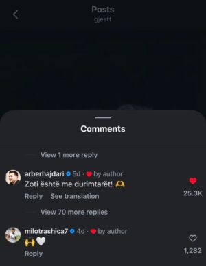 Ky mesazh, i shkruar pa zhurmë dhe pa retorikë të tepruar, u përqafua masivisht nga publiku, duke grumbulluar mbi 25 mijë pëlqime dhe duke u shndërruar në koment-in simbol të gjithë postimit. Një fjali që u lexua si solidaritet njerëzor, por edhe si një përqafim moral, në një moment kur fjala shpesh vlen më shumë se çdo analizë.